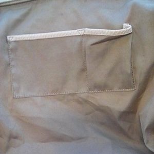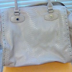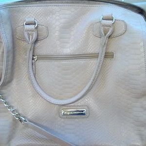 Cream color Steve Madden bag, large with gold chain accents on straps. Inside is as clean as the outside because this bag has never been used. Pockets inside and side, zipper pocket on front.