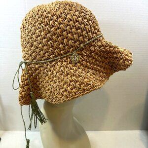 Green paper cord/string tied around base of hat w/a gold tone "SM" tag attached