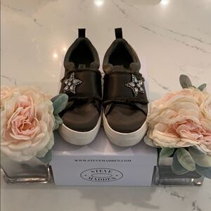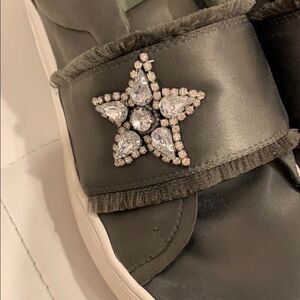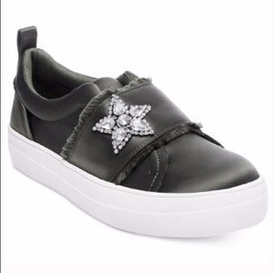 Satin sheen and a sparkling brooch bring street-chic savvy to your favorite jeans in these Graphic platform sneakers from Steve Madden. Round-toe slip-on platform sneakers with brooch embellishment 1" platform heel Satin fabric upper; manmade sole