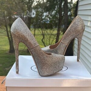 Base is like a Pewter, Gems are silver Heel is approx 6.5'