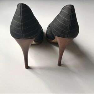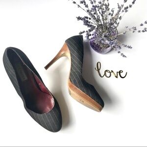 Fun black denim style material with faint white pinstripes and wooden style bottoms. The heels show minimal amounts of wear on outside, marking/scratch on inside of one shoe but not noticeable on outside. Pair these with jeans for a hot look or with your favorite dress!