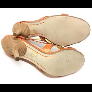 Steve Madden " Demurre" Orange with gold undertones. Snake skin. Animal print. Wood Grain 4 1/2 inch heel. Open toe. Slip on. Very good used condition. Shoes may show signs of wear. Please refer to pictures for condition of leather, sole & heel. Zooming in is recommended. Colors may very due to light & computer. 092317 RWBCARB02