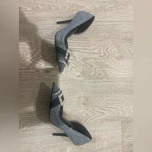 Stylish denim heels with a sparkling crystal buckle. Perfect for adding flair to any outfit. Never worn, just tried on in the store.