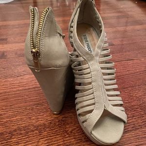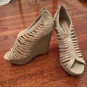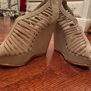 super fun tan wedges. cutouts in a tan leather, with golden detailing along the whole bottom of the shoe as well as the zipper closure, worn 2x, still have the tags on the bottom