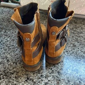 Steve Madden Dormaa light Suede Moto Bootie Buckles Size 6.5M side zip double buckle accent in dark brown leather