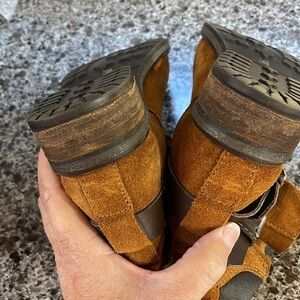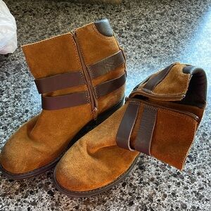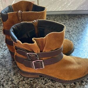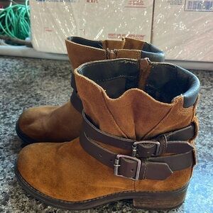 Steve Madden Dormaa light Suede Moto Bootie Buckles Size 6.5M side zip double buckle accent in dark brown leather