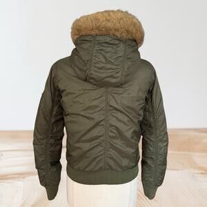 Steve Madden Down insulated Bomber Jacket Sz S Women's Faux Fur Trimmed Hood in a darker Army Green