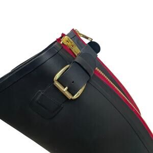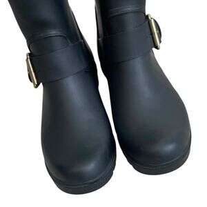 Incredible black Dreench rubber knee high rain boots with gold buckle accents