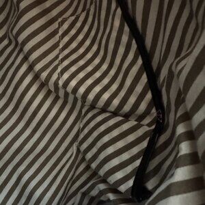 Inside features a gray and white striped lining with a generous zipper pocket on one side and 2 slit pocket openings on the other.