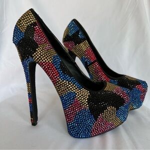 Steve Madden Dyvinal Rhinestone Heels. Stunning platform heels with black, gold, red, and blue crystal rhinestones all over. Pre loved but still in great condition. Any imperfections are shown in the pictures. Size 7 1/2.