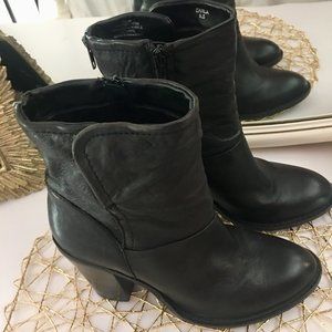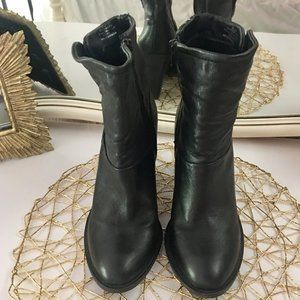 Brand is STEVEN by Steve Madden, US size 9.5, excellent preowned condition, no flaws to note, only worn like twice (the heel was higher than I wanted for everyday use). Leather black booties with a stable chunky heel, functional side zipper (with a fake back zipper for show), round toe, and adjustable top. Norm-core?? I guess??
