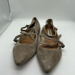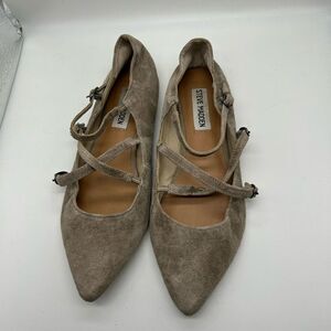 Edggy flat from Steve Madden. Taupe suede leather upper. Adjustable criss cross instep straps. Pointed toe. Size 7. Good preowned condition with minor wear. See photos for full condition.
