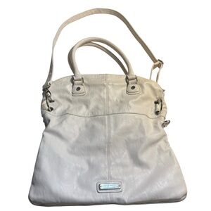 Sophisticated cream/white shoulder bag by Steve Madden. Sleek design with dual handles and a removable and adjustable crossbody strap. Silvertone hardware.