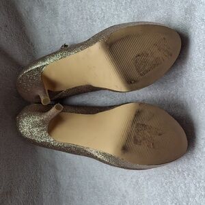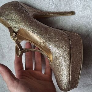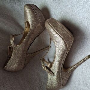 Step out in style with these elegant glittery heels. Perfect for any occasion, these shoes add a touch of glamour to your outfit. they are Steve Madden brand, excellent condition. t-strap with tiny buckle. perfect for parties!! size 8.
