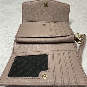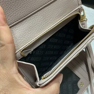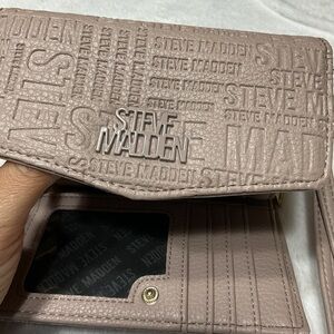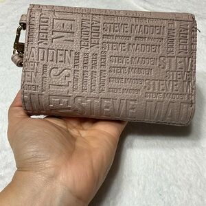 Chic Steve Madden wristlet with embossed logo pattern. Includes a handy wrist strap. Soft blush hue.