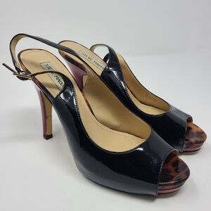 Black faux leather Evan peep-toe slingback heels from Steve Madden, size 8. Gold hardware, tortoise shell trim around edges and on toes of shoes. Ankle strap closures. Heels measure at approximately 3" inside and 4.5" outside. E