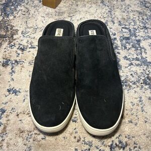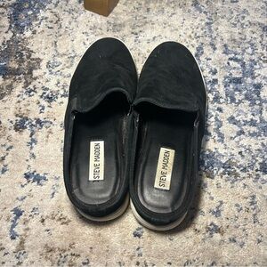 Steve Madden Ezekiel Black Suede Slip-On Mules. Has some wear on the black suede. Some scuffing along the white edges. As shown in photos above. Minimal signs of wear on the bottoms. Also shown in photos above. In otherwise great preowned condition. Feel free to make a reasonable offer through the offer button! Brand: Steve Madden Size: 8.5 Pet & smoke free home 14