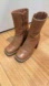 These mid-calf heeled boots by Steve Madden are crafted from rich brown leather, featuring a smooth finish and a chunky 2-3 inch heel. The square-shaped toe and side zipper ensure both style and ease of wear, making them a timeless addition to any wardrobe.