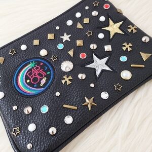 Steve Madden Far Out studded wristlet bag. Black pebbeled faux leather with a mix of patches. Studded with pearls, rhinestones, stars, pyramid studs, and spikes. Zipper top. Wristless strap.