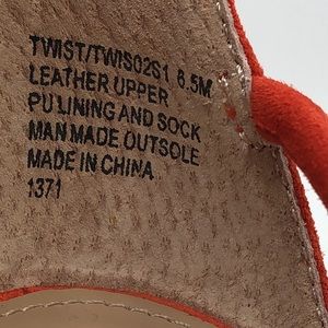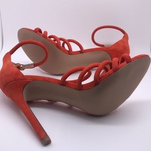 Eye-catching orange heels with spiral straps. Elegant stiletto design.