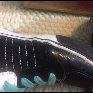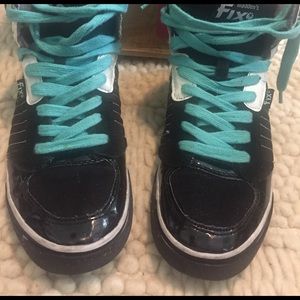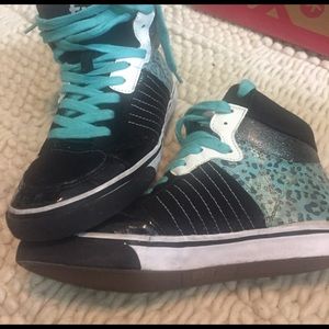 These are used sneakers in black and turquoise cheetah print with some metallic thrown in. They are high top and are laced in the front. They show sign of scuff marks. And it shows a little sign of peeling on the side.