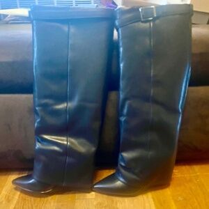 Two pair of Stylish Steve Madden Knee High, faux leather Flap Overlay Boots in Red and Black with 3" wedge heel and pointed toe. The red pair is new and unworn, the black pair was worn once. Be a standout and up-to-date with these sophisticated boots that are all the rage on the streets of Milan, Italy. These knee-high boots are perfect for turning heads during cooler seasons and pairing with layered fall-to-winter outfits. Comes in original boxes with foam form inserts. For sale at $34.00 per pair.