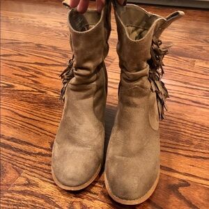 Suede bootie with fringe. Very comfortable. Size runs big! I’m normally an 8.5 these are a 7.5 and fit perfectly. Slightly worn on the bottom but the rest looks like brand new! Make an offer!