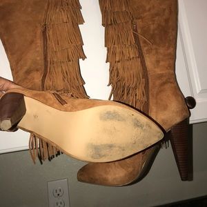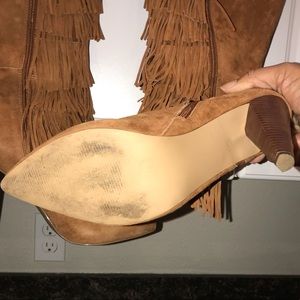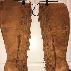 Over the knee or if your taller just under the knee. Shaft measures 19”. Tan suede. All fringe and zipper in tact. Worn once. Great condition. Platform pointed toe makes them very comfortable to wear a 4.25” heel.