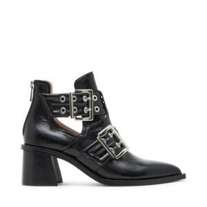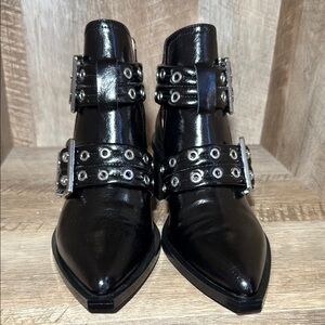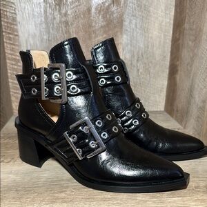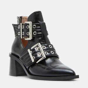 Wide, grommeted straps across the pointy-toe vamp and cutout shaft toughen up this block-heel, leather moto boot that allows you to unleash your inner rebel. 2 1/2" heel 4" shaft Adjustable straps with buckle closures Leather upper/synthetic lining and sole Imported