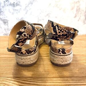 Description: Steve Madden snakeskin print espadrille platform sandals with an open toe.