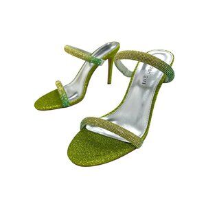 These green glitter stiletto heel sandals feature a sophisticated design with rhinestone straps, ideal for refined events or elegant evenings.