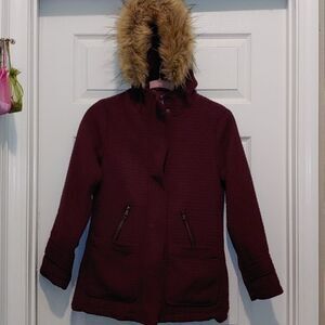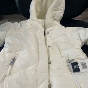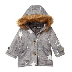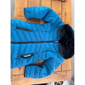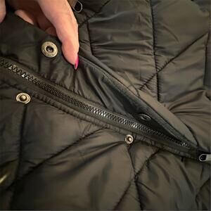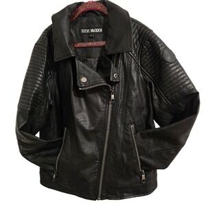 This Steve Madden puffer jacket for girls is designed for winter wear. It features a quilted design with a faux fur trim and offers both zipper and button closures. Made from 100% nylon with a 100% polyester lining, it is insulated with down for warmth. The jacket is black, mid-length, and has long sleeves, making it suitable for casual occasions. It includes two front pockets and is machine washable. Size is 5-6. The jacket is pre-owned.