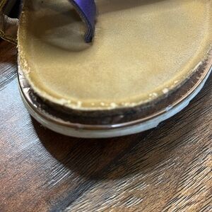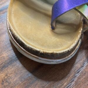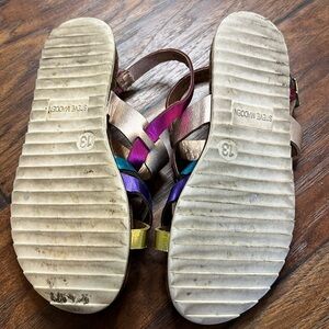 Steve Madden Girls Mistling Iridescent Multi Color Strappy Cork Softbed Sandals Sz 13. Teal strap on right sandal has some dark marks