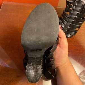 Heels are 5" and solid black with adjustable strap in the bak for stability and support. Nine straps go up the top of the shoe for style and support.