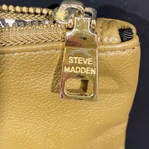 Chic and versatile Steve Madden clutch in a soft gold-tan faux leather with a pebbled texture. Features a shiny gold zipper pull engraved with “Steve Madden” and a bold black-and-white geometric print lining. Compact yet roomy enough for your phone, keys, cards, and small essentials — perfect for day or night use. Measures approx. 9” W x 5” H.