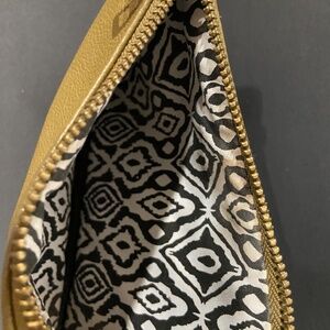 Steve Madden wristlet, gold clutch, faux leather pouch, geometric lining, evening bag, travel pouch, neutral handbag, designer accessories