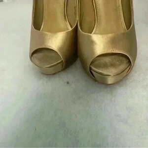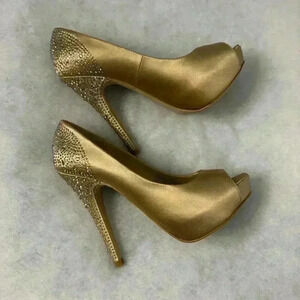 Steve Madden Gold Satin Open Toe 5 1/2” Rhinestones Cover Heels Size 6.5
