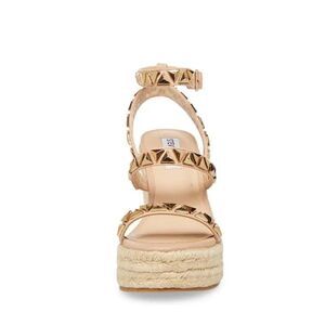 Stylish gold wedges with studded straps. Comfortable jute platform. Perfect for any occasion.