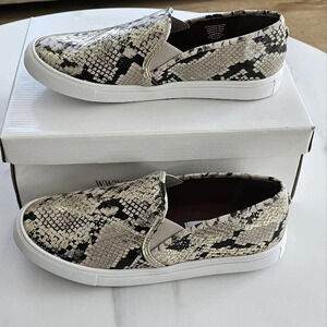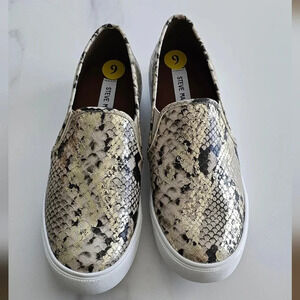 These stylish sneakers feature a luxurious gold and cream color scheme with a unique snakeskin pattern. Designed for easy wear, they offer a comfortable slip-on silhouette perfect for casual outings.