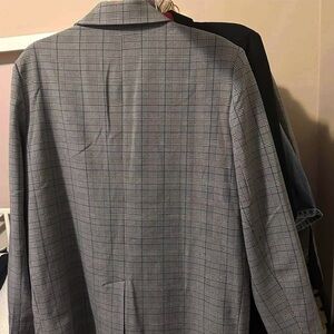 Stylish gray checkered blazer. Ideal for business or casual wear. Sharp and versatile design.