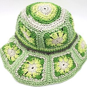 HP! Crocheted scalloped brim bucket hat in shades of green with ivory & gray in the mix; this paper yarn hat is a breath of fresh air and perfect for Spring!