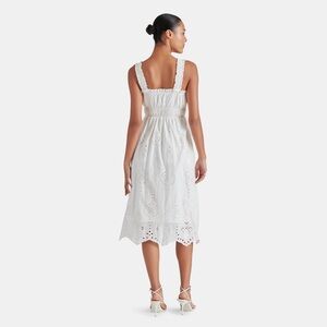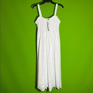 This elegant white eyelet midi dress is perfect for any occasion. Its delicate design offers a timeless look that is both stylish and comfortable.