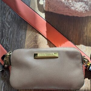 • Features: Wide adjustable coral/pink strap, gold hardware, zip closure