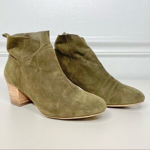 Steve Madden Harber Suede Leather Ankle Boots in Moss. Women's Size 6.5. 100% leather suede upper, pull-on style, raw cut collar, almond toe, stacked heel, cushioned insole. Approximate measurements: 5" shaft, 2.25" heel. Very good pre-owned condition, moderate signs of wear throughout.