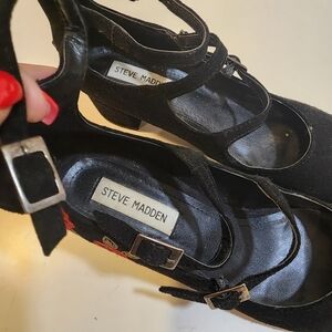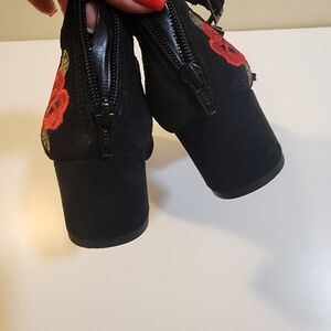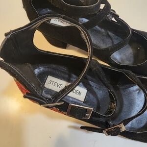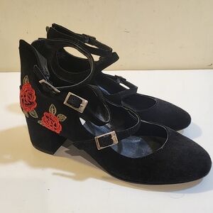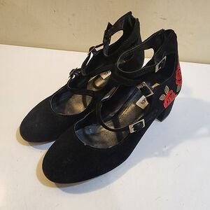 Steve Madden Hedley Black Suede Block Heels with Embroide Red Roses 7.5