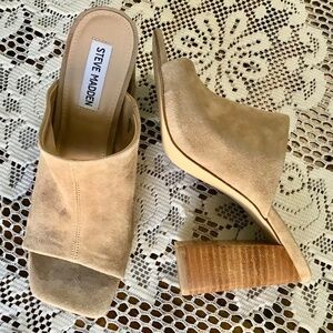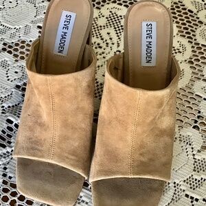Used Steve Madden Tan slip on~Squared toe~Chunky heel 4.25”