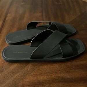 The Steve Madden Horizon black sandal is an effortless new flat — a classic crisscross slide, made sophisticated by modern matte metallic surfaces.