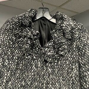 Black, White and Gray Steve Madden coat with ruffles around the collar 5 buttons down the front….Size small