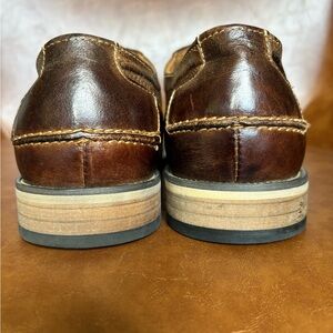 Classic brown leather oxfords with a sleek design. Perfect for formal and casual wear. Durable and stylish. Shoes are like new minus some wear on the bottom. One area has some stitching that came lose. Does not affect function of the shoe. See pictures. Sold out online in this size and color.
