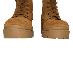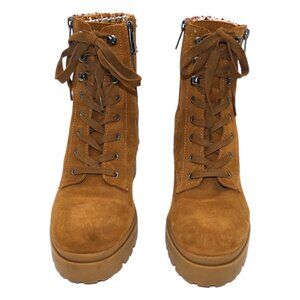 Steve Madden Jaydin Suede Lace-Up Booties Lug Sole Block Heel Tweed Collar Tan 9